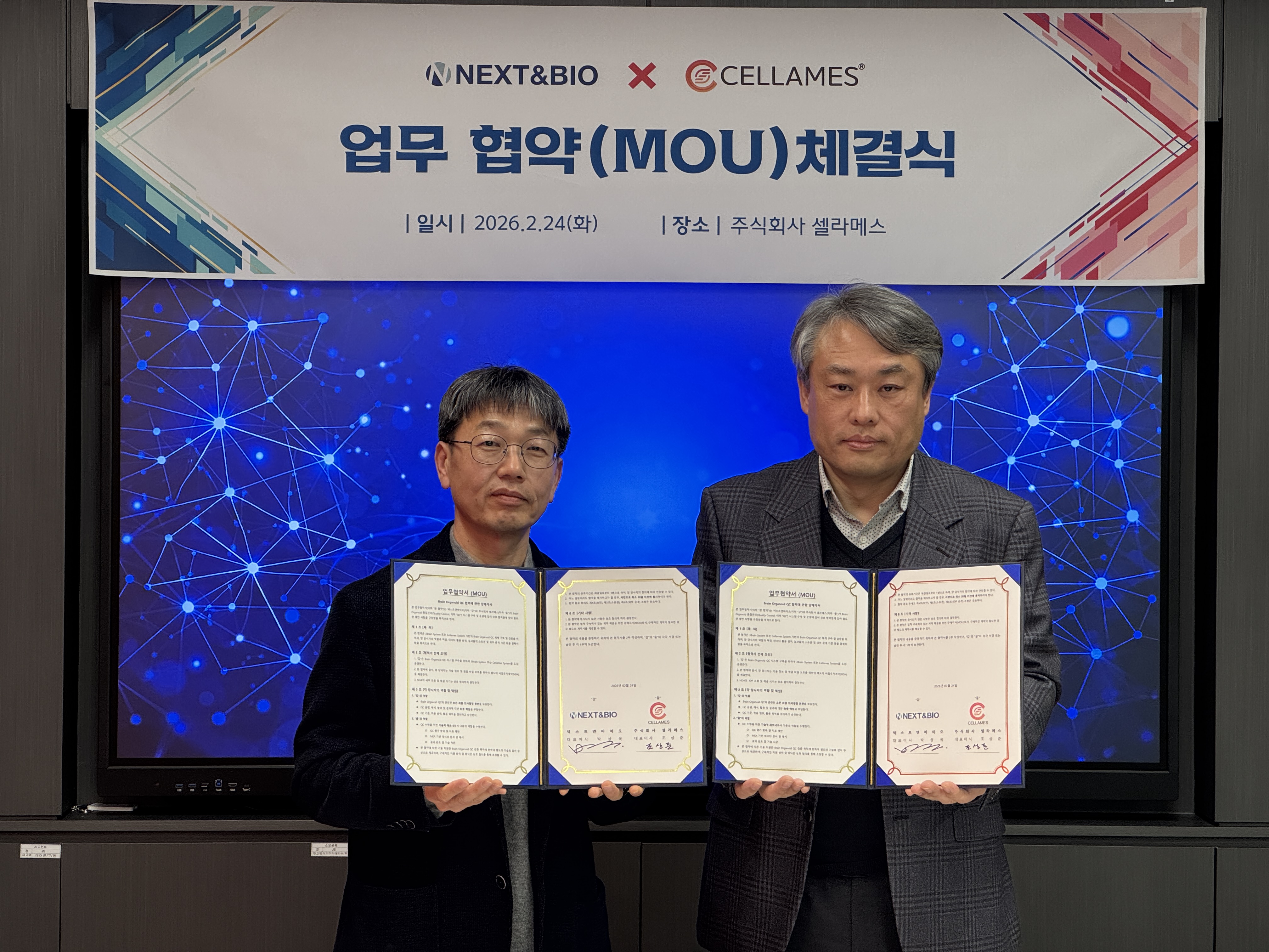 전기생리 분석 기술을 보유한 셀라메스와 오가노이드 기업 넥스트앤바이오가 뇌 오가노이드 생산과 품질관리(QC) 체계 구축을 위해 협력한다.